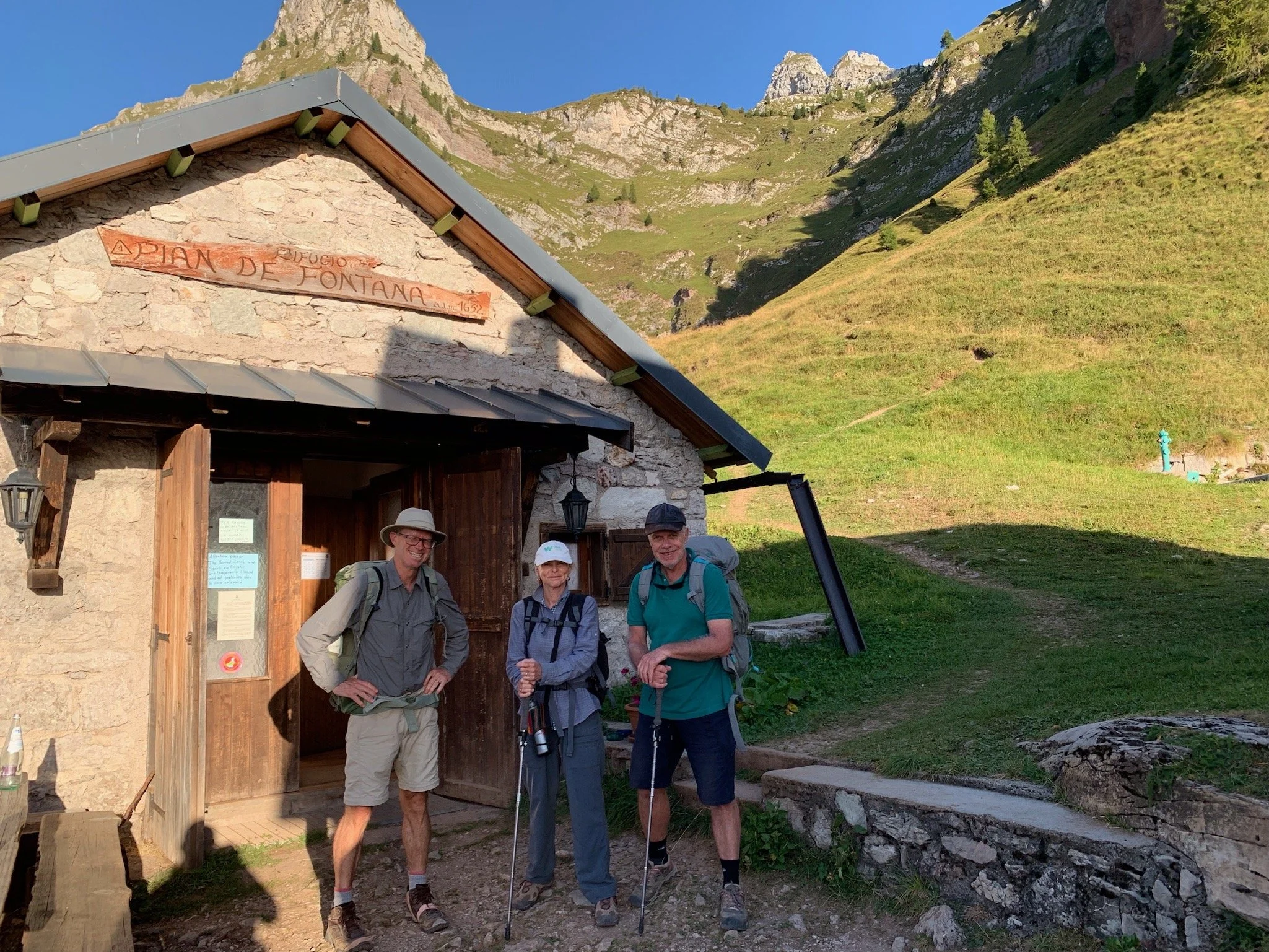 The afternoon stretch is pretty challenging - we climb steeply up to Forcella de Zita Sud (2,395m) and then descend equally dramatically to the renovated shepherd huts that comprise our refuge for the night. The climb involves a hands-on rock scramble up a quite narrow rocky ridge. At the Forcella there is a grassy terrace that affords welcome space and security. At this point, a group of Americans in their 20’s employ their drone to try to locate a member of their group who has dropped behind. Gotta say, it beats descending to try to find him.