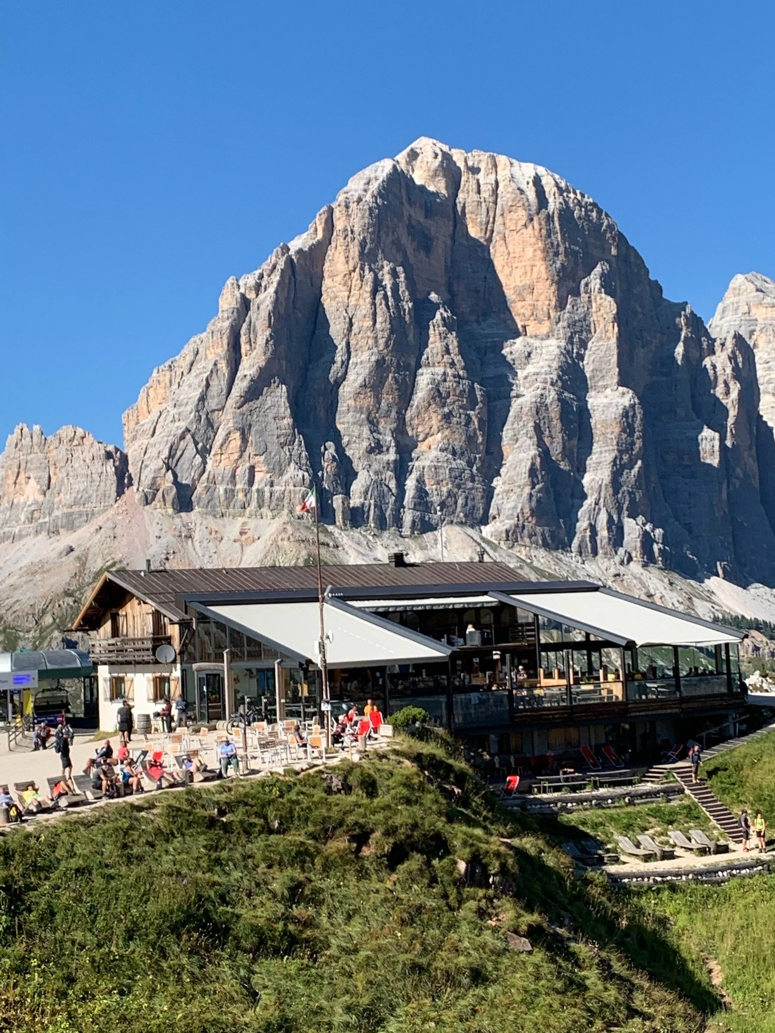 Rifugio Dibona, our chosen lunch spot, is a welcome sight. Its flower adorned terrace has wonderful mountain views and vacant tables. However, the terrace has limited shade. For baked and overheated walkers, shade at lunchtime is non-negotiable. A sun umbrella is installed. I’m reminded yet again of the differences between walking in the European alps and walking in most other areas of the world. My lunch is a tuna Niçoise salad followed by warm apple strudel, Andrew has mushroom ravioli and Fiona (as always, the most daring) has blueberry tagliolini. The challenges of the hot and tricky scree slope fade into the background.