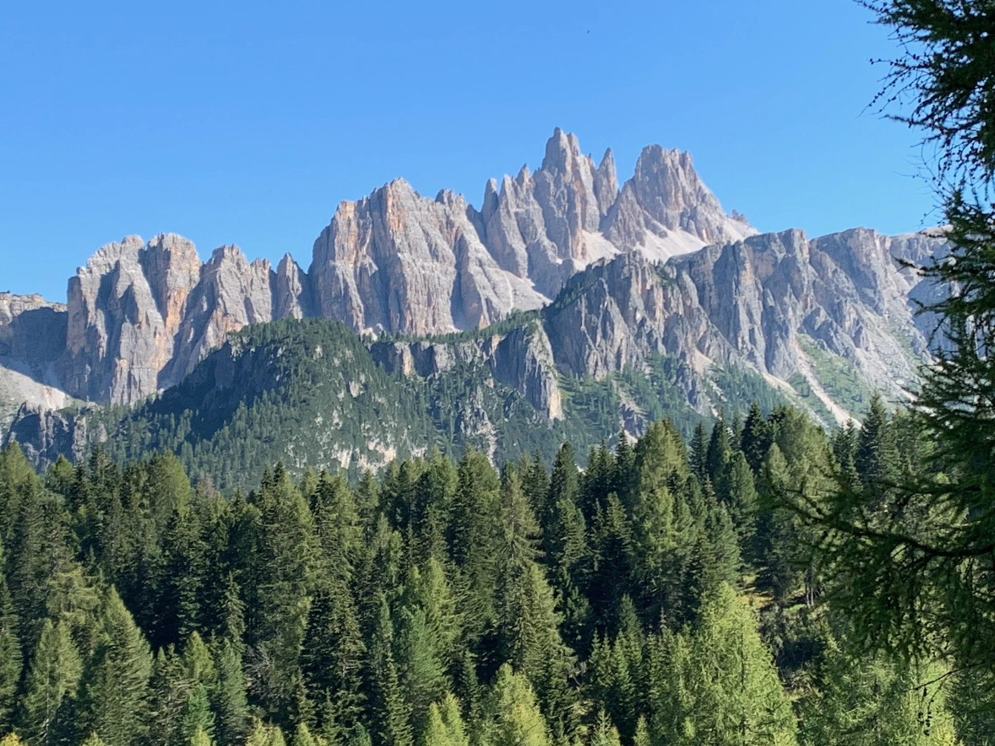 We expect today will be demanding so we farewell Rifugio San Sebastián bright and early. We climb up though thick forest that’s still damp from the overnight dew. It will be warm again this afternoon so we relish the coolness of the forest. Sadly, the bark beetles are present in this area and some of the conifers have succumbed.