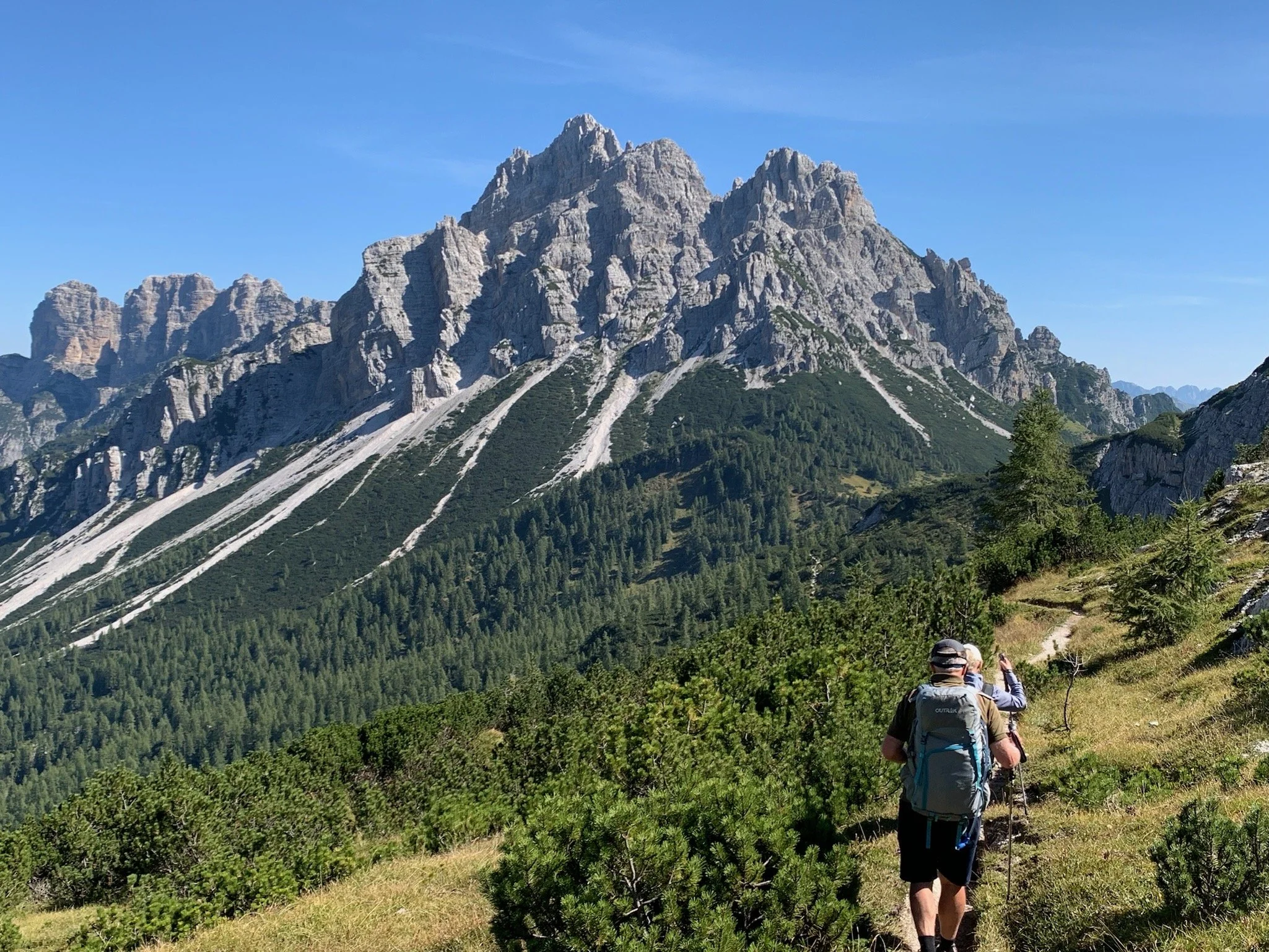 We walk through more conifer forests today, although we’re never far from the scree slopes that fall away from the looming Civetta and Moiazza mountain groups. Occasionally, of course, the track-maker can’t resist a foray up a scree slope to the very cliff-face of the mountains. Rifugio Carestiato is the only refuge we pass en route today. We spot it from afar, but it proves elusive and it seems an eternity before we reach it. We’re disappointed. It’s busy (as there’s a road further on that gives access to it) and its terrace is baking in unshaded sun. No attraction to us beetroots. We find a patch of grass in half-shade behind the refuge and drink our water.