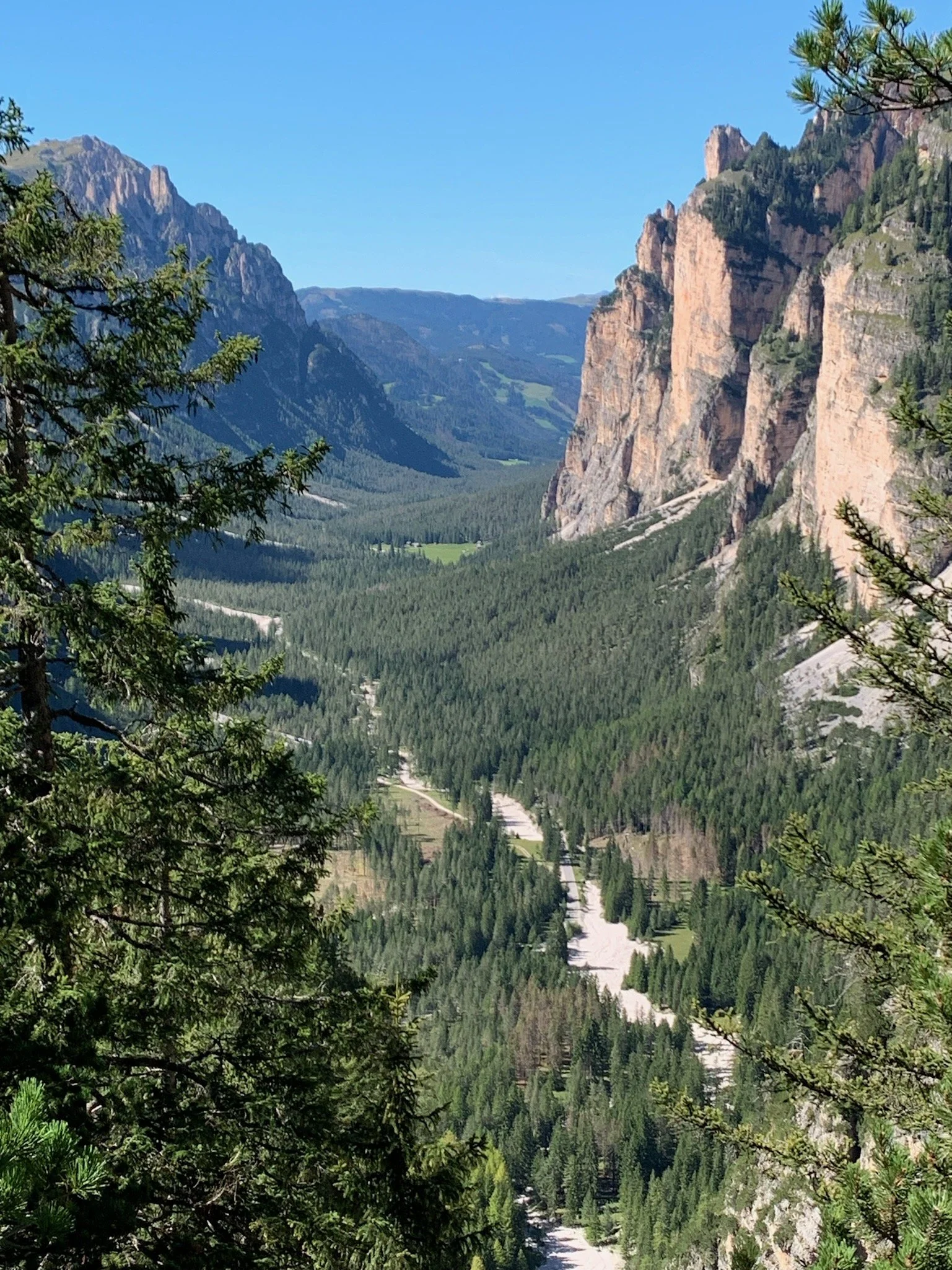 Post-lunch we revel in the first forest walking of the trip. This stretch does also involve a plummet to a valley floor and then a lung-busting climb but, hey, this is the Dolomites what would you expect?